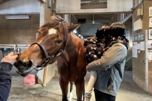 ただし、過去見学した中で1番やんちゃでした。見学中はこの通り。見学後も、振り返ると厩舎に戻りたくないと暴れてました。